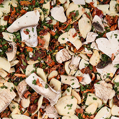 Delicata miscela di vegetali disidratati a base di aglio e peperoncino, ottima per preparare condimenti per pasta.
