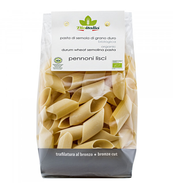 Italian organic durum wheat semolina pasta from certified chain, bronze drawn.