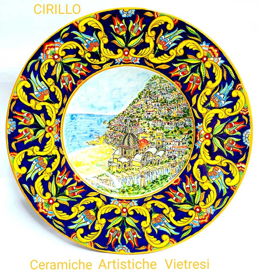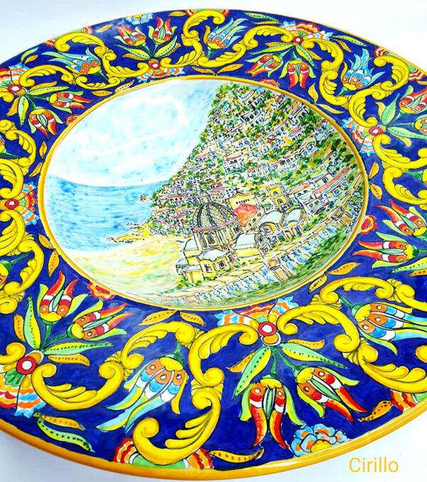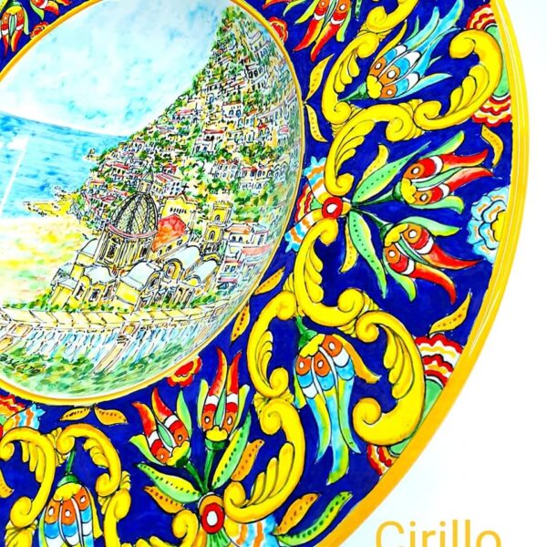 Soggetto Paesaggio Positano, contornato da voluta barocca e boccioli di fiore multicolore, fondo blu intenso.