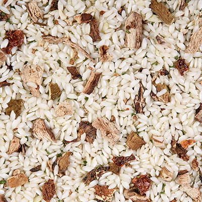 Delizioso risotto a base di riso italiano carnaroli con funghi porcini disidratati, condito con spezie ed erbe aromatiche e pronto per la cottura.